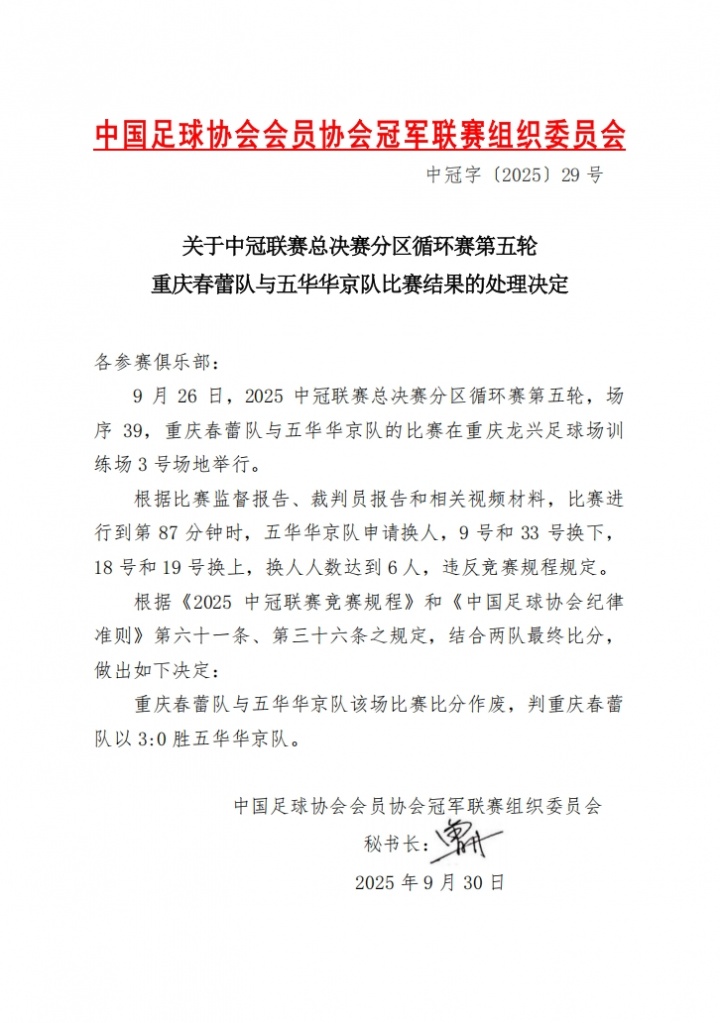 09月30日讯 中冠决赛阶段分组赛第5轮,重庆春蕾1-3不敌五华华京。中国足球协会会员协会冠军联赛组织委员会发布公告,由于五华华京队换东谈主东谈主数达到六东谈主,违犯竞赛规程门径,该场比赛五华华京被判0-3负。