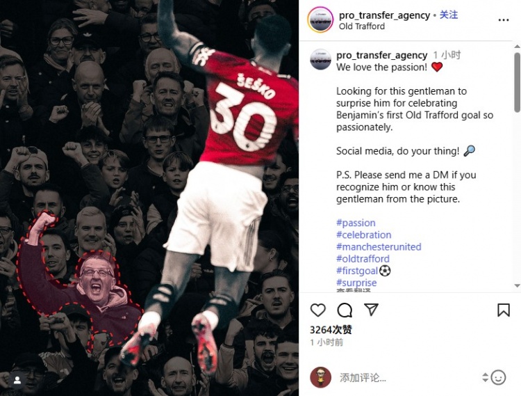 舍什科的经纪公司Pro Transfer Agency晒出这位球迷的像片,并写谈:“咱们爱这份情谊!正在寻找这位先生,念念给他个惊喜,因为他为舍什科的老特拉福德首球进行了如斯眷注的庆祝。”