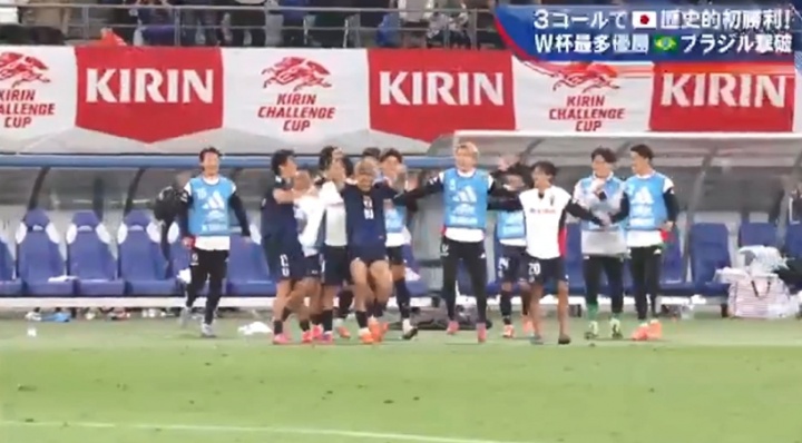 10月14日讯 麒麟杯海外友谊赛,日本主场让二追三逆转五星巴西,赛后日本替补席实在全员冲入场内厚谊庆祝。这是他们历史初次打败巴西这一劲敌。