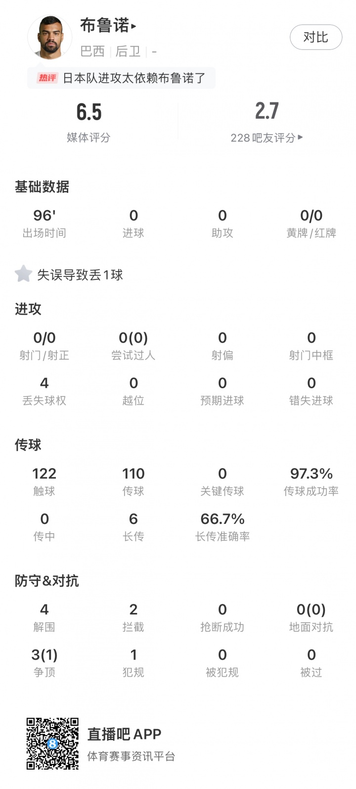 此役,巴西首发中卫布鲁诺献艺熬煎级别发扬,先是腿软送敌手单刀,尔后又突围时失慎爆射自家球门,告成匡助日本队完成让二追三。