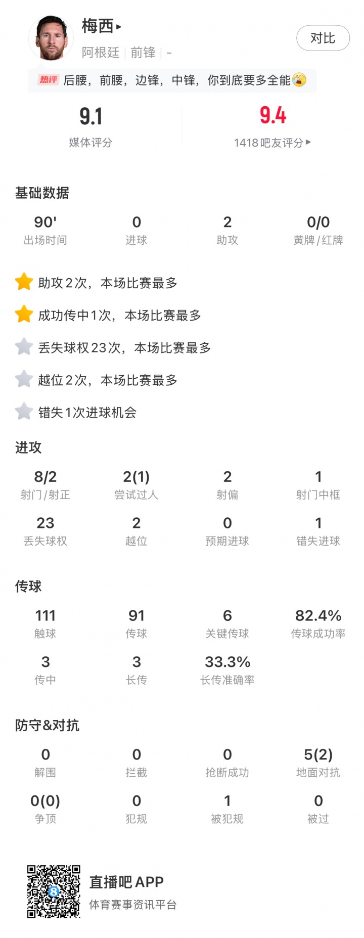 今天改作念饼!梅西全场数据:2助1框,6次关节传球!111次触球