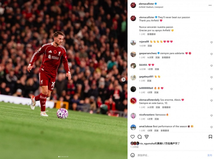 本场比赛麦卡利斯特首发出战,赛后他也在个东谈主社媒晒出本场像片,配文写谈:“咱们的心扉遥远不会被卓越!感谢安菲尔德!”