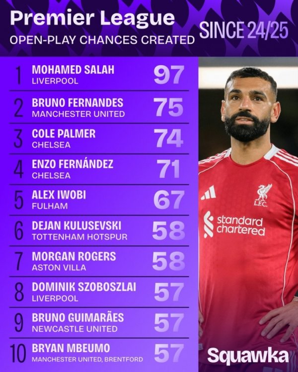 英超通顺战创造契机次数排名:萨拉赫居首 B费、帕尔默分居二三位