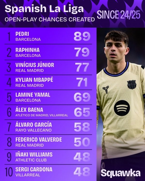 10月16日讯 日前,Squawka统计了西甲通顺战创造契机次数排名,佩德里、拉菲尼亚前二,维尼修斯第三。 1、佩德里(巴萨):89次 2、拉菲尼亚(巴萨):79次 3、维尼修斯(皇马):77次 4、姆巴佩(皇马):71次 5、亚马尔(巴萨):69次 6、巴埃纳(马竞/比利亚雷亚尔):65次 7、阿尔瓦罗-加西亚(巴列卡诺):58次 8、巴尔韦德(皇马):50次 9、伊纳基-威廉姆斯(毕尔巴鄂):48次 10、卡尔多纳(比利亚雷亚尔):48次......查看更多