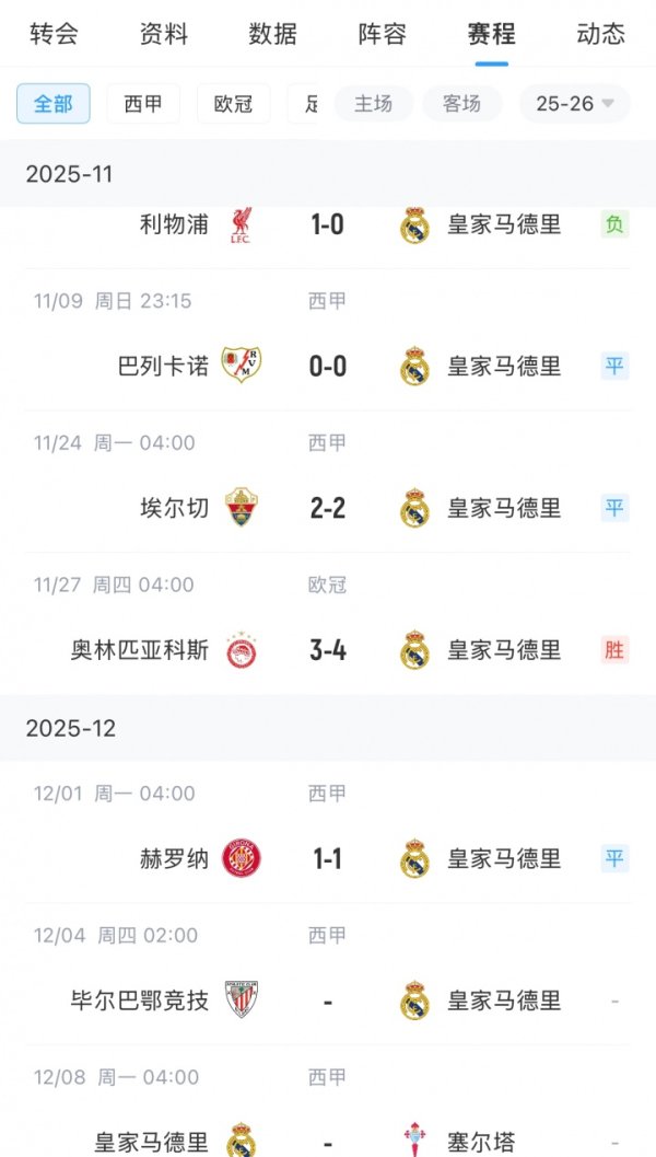 漫长!皇马六连客踢完5场战绩1胜3平1负,赢的一场为欧冠险胜