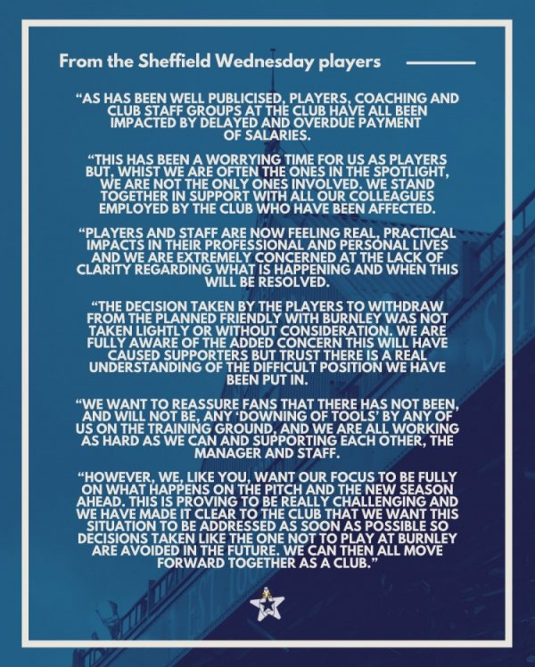 8月5日讯 谢周三原定上周末友谊赛对阵英超升班马伯恩利。联系词,谢周三球员聘用隔断出战。当天,谢周三球员发表声明默示球队隔断出战是因为工资被拖欠,但愿俱乐部尽快责罚这一问题。 谢菲尔德星期三球员的声明: 正如媒体平方报说念的那样,俱乐部的球员、教学以及职责主说念主员群体都受到了工资蔓延和拖欠的影响。 这对咱们球员来说是一段令东说念主担忧的时分。诚然咱们频频处于聚光灯下,但咱们并不是惟一受到影响的东说念主。咱们与统共受此影响的俱乐部共事协作一致,共同面对逆境。 球员和职责主说念......查看更多