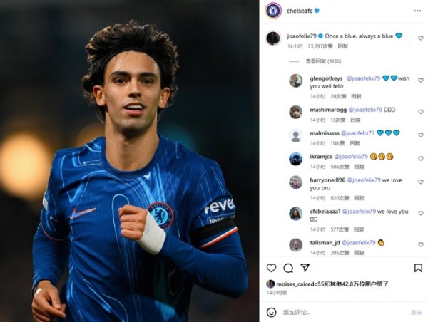 两次效劳40场11球2助1冠!菲利克斯留言:一日蓝军,终身蓝军💙