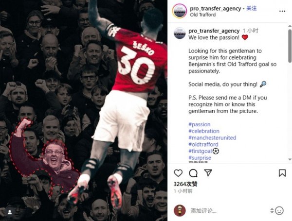 10月7日讯 曼联先锋舍什科的经纪公司在Instagram发“寻东谈主缘起”,找那位在舍什科进球后猖獗庆祝的曼联球迷。 舍什科的经纪公司Pro Transfer Agency晒出这位球迷的像片,并写谈:“咱们爱这份情谊!正在寻找这位先生,念念给他个惊喜,因为他为舍什科的老特拉福德首球进行了如斯眷注的庆祝。” “酬酢媒体,发达你的力量吧!” “附:要是认出或意志图中的这位先生,请私信咱们。”......查看更多