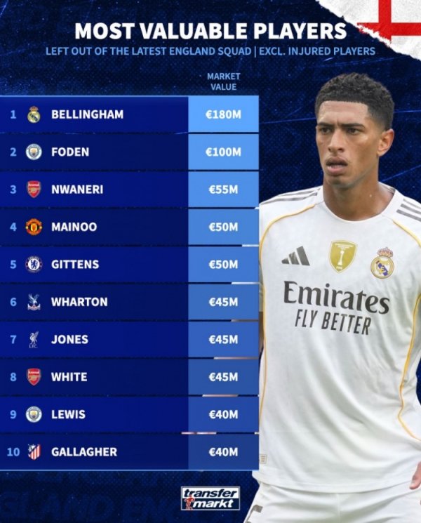 未入选本次英格兰名只身价榜:贝林厄姆居首,福登、恩瓦内里在列