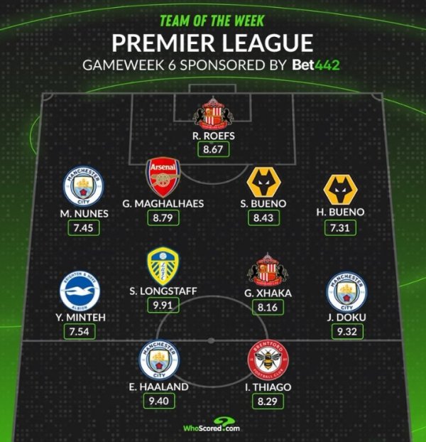 9月30日讯 英超第6轮战罢,数据网站Whoscored也清点了本轮英超评分最高阵,具体如下: 门将:罗夫斯(桑德兰) 后卫:努内斯(曼城)、加布里埃尔(阿森纳)、圣地亚哥-布埃诺(狼队)、乌戈-布埃诺(狼队) 中场:明特(布莱顿)、朗斯塔夫(利兹联)、扎卡(桑德兰)、多库(曼城) 前卫:哈兰德(曼城)、伊戈尔(布伦特福德)......查看更多