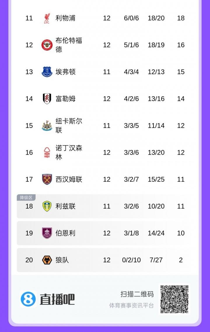 11月23日讯 英超第12轮,利物浦主场0-3不敌丛林,名次跌至第11名。