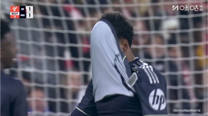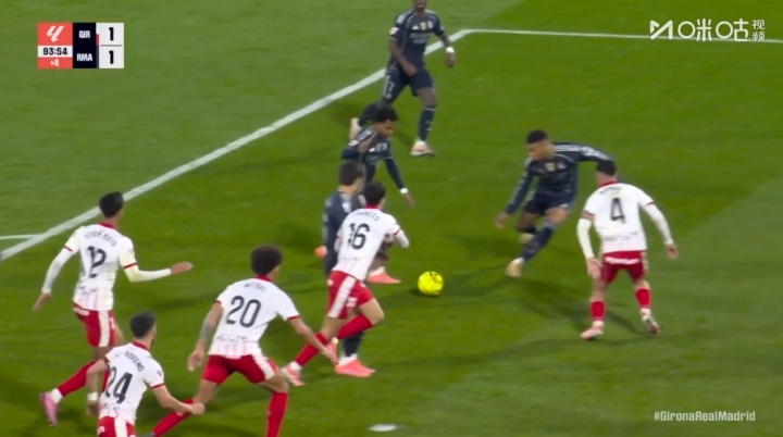 西甲第14轮,皇马客场1-1战平赫罗纳,读秒阶段皇马得谢绝杀契机,贝林厄姆禁区横敲,正对球门的罗德里戈调动步点准备射门,这时正对来球但侧对球门的姆巴佩中途杀出,回身兜射打偏。