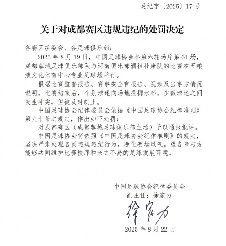 2025年8月21日,成齐市公安局金牛离别局发布警情通报,足协杯半决赛后闯祸三东说念主被行政拘留。
