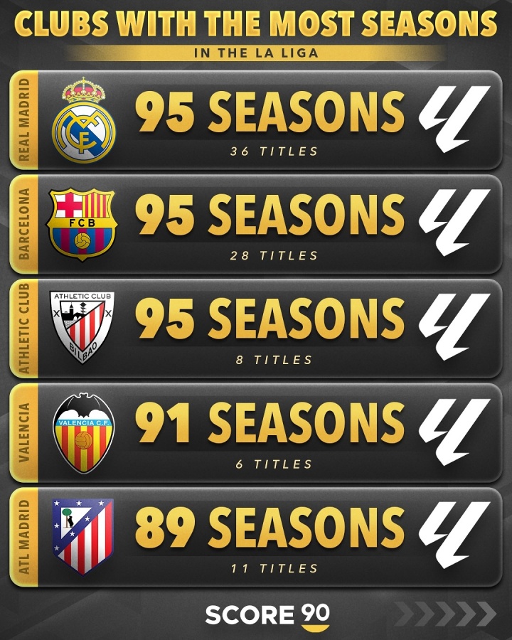 西甲参赛时长:皇马95赛季36冠 巴萨95赛季28冠 马竞89赛季11冠