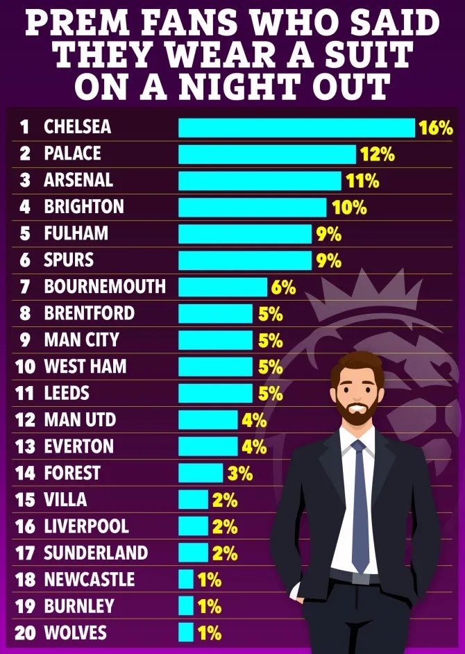 比拟之下,纽卡斯尔、伯恩利和狼队的球迷则排行垫底,仅有1%的东谈主会聘用正装出行。