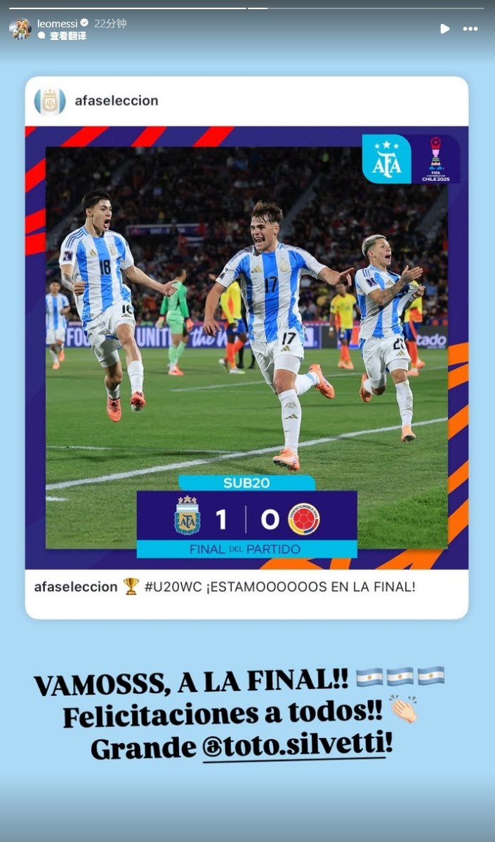 10月16日讯 今天,阿根廷U20打败哥伦比亚U20,挺进世青赛决赛,比赛为止后,梅西在Instagram发文,恭喜了球队。
