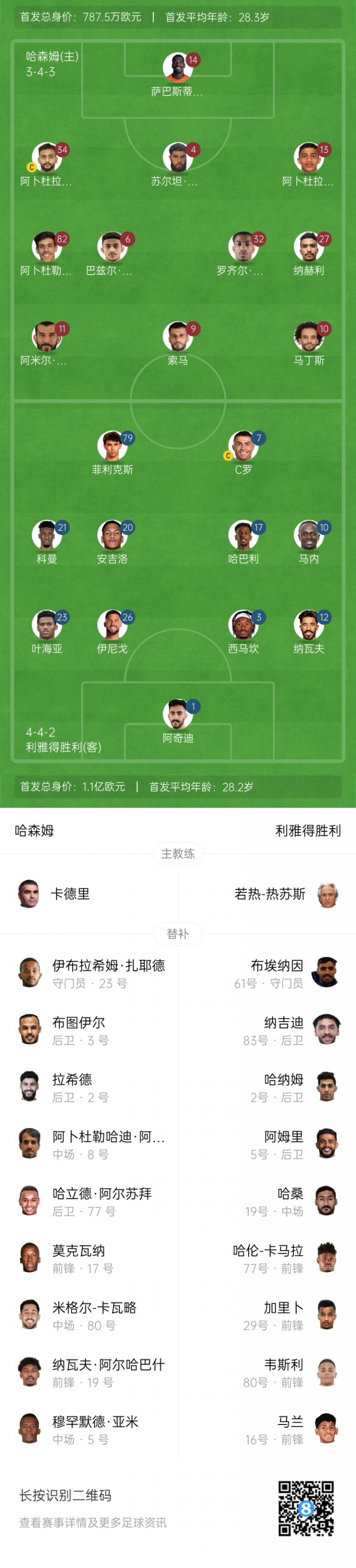 利雅得告捷首发:1-阿奇迪、12-纳瓦夫、3-西马坎、26-伊尼戈·马丁内斯、23-叶海亚、17-哈巴利、20-安吉洛、79-菲利克斯、21-科曼、10-马内、7-C罗