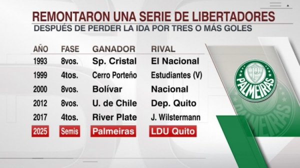 开脱者杯首回合净负3球次回合逆转,帕尔梅拉斯是历史第6队
