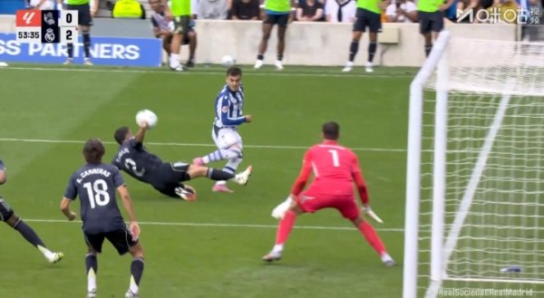 10东说念主皇马被扳回一球!卡瓦哈尔手球送点,奥亚萨瓦尔点射破门