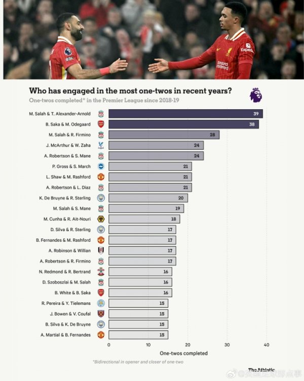 TA统计2018/19赛季以来英超二过一勾通次数榜单↓ 👑 萨拉赫 厄德高(阿森纳)—— 38次 🥉 萨拉赫 麦克阿瑟(水晶宫)——24次 ✨ 罗伯逊 马奇(布莱顿)——21次 ✨ 卢克肖 路易斯·迪亚斯(利物浦)——21次 ✨ 德布劳内 马内(利物浦)——19次......查看更多