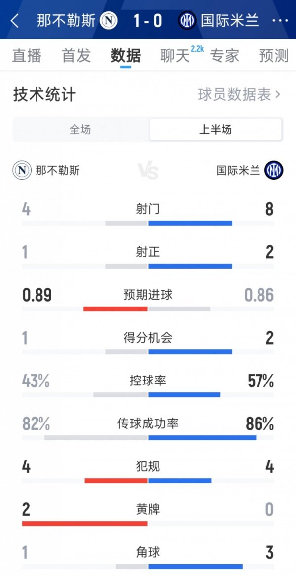 那不勒斯1-0国米半场数据:射门4-8,射正1-2,得分契机1-2
