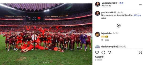 9月10日讯 U23亚洲杯预选赛第三轮,U22国足0-0战平澳大利亚U22,两队联袂得到U23亚洲杯正赛经验。 赛后前国脚、现担任U22国足栽植构成员的于大宝更新社媒,晒出了赛后全队庆祝的合照,并用葡语写谈:“让咱们沙特邂逅。” 前归化国脚艾克森现身挑剔区为这条社媒点赞。......查看更多