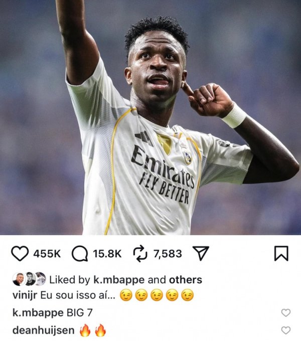 维尼修斯社媒晒照庆祝到手,姆巴佩点赞批驳:BIG 7