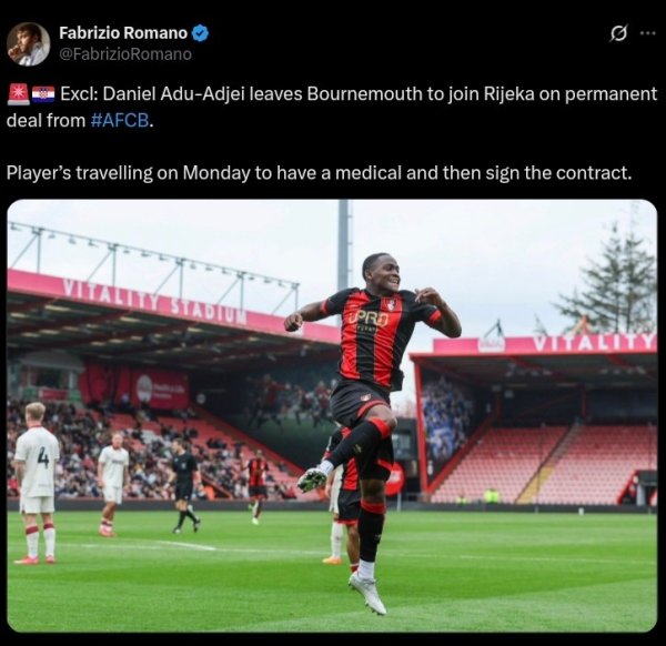 罗马诺:伯恩茅斯20岁先锋阿杜-阿杰伊将转会里耶卡,周一体检