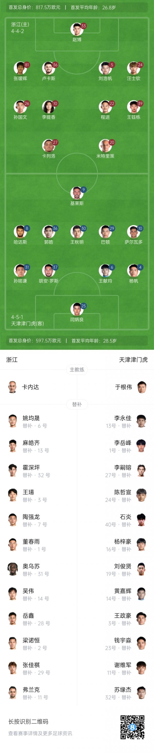 浙江vs津门虎首发:3外助PK4外助!王钰栋、米特里策、基莱斯先发