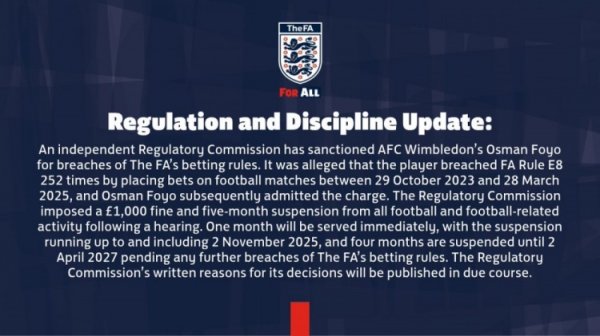 10月4日讯 英足总官方发布公告,阐述英甲球员奥斯曼-福约因违背博彩条例被禁赛5个月。 英足总公告实践: 孤独监管委员会已对AFC温布尔登球员奥斯曼-福约违背博彩条例的步履作出惩处。据指控,该球员在2023年10月29日至2025年3月28日历间对足球比赛进行投注,违背英足总E8条例252次。 奥斯曼-福约承认了这一指控。监管委员会在听证会后对其处以1000英镑罚金,并禁赛五个月,拦阻参与悉数足球相关行径。其中一个月立即践诺,禁赛期直至2025年11月2日,其余四个月宽限践诺......查看更多