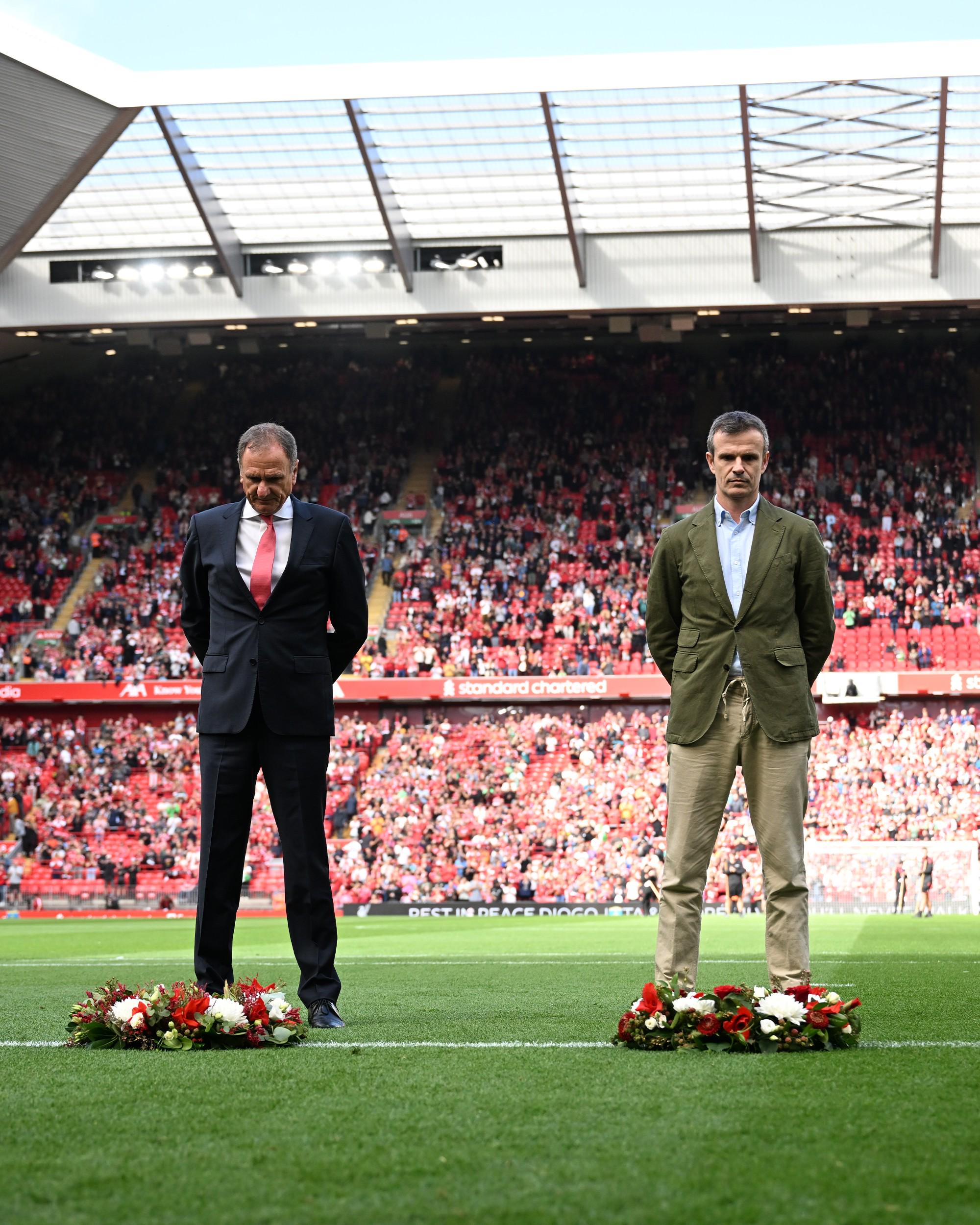 比赛初始前,利物浦名宿菲利普-汤普森与毕尔巴鄂竞技主席乔恩-乌里亚斯特一说念,在安菲尔德北看台(Kop看台)前献上花圈,以回首此前因车祸圆寂的若塔昆季。