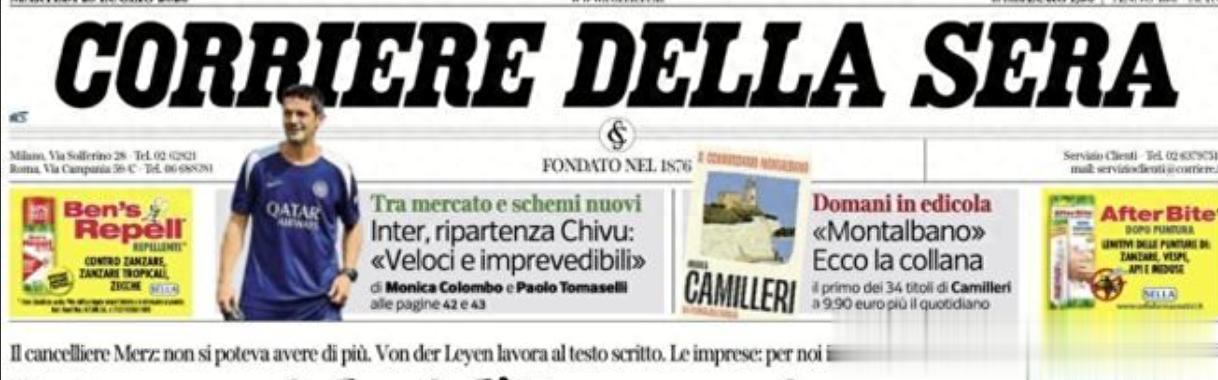 意大利刊行量最大的报纸《晚邮报》,近期内第二次将皆沃放到显要版面。