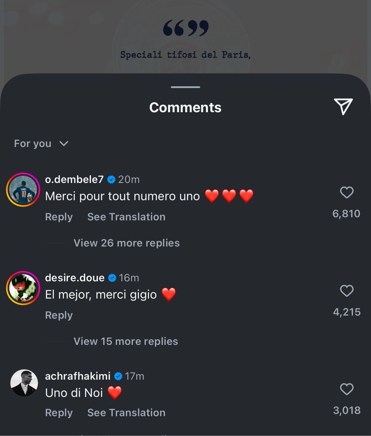 雷速体育8月13日讯 多纳鲁马当天在社媒官宣我方将离开巴黎圣日耳曼,包括登贝莱、杜埃等队友在该帖子底下奉上祝颂。