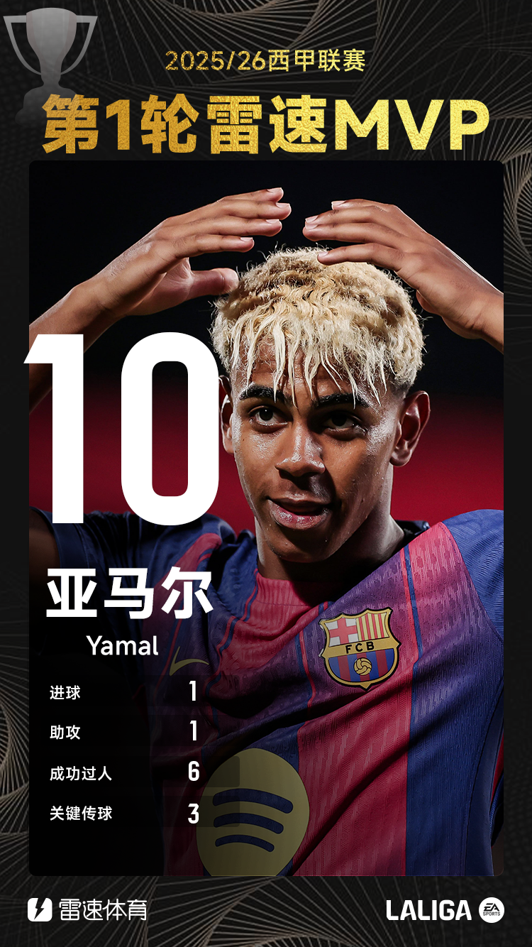雷速西甲评比:一传一射助巴萨全取三分,亚马尔当选西甲首轮MVP