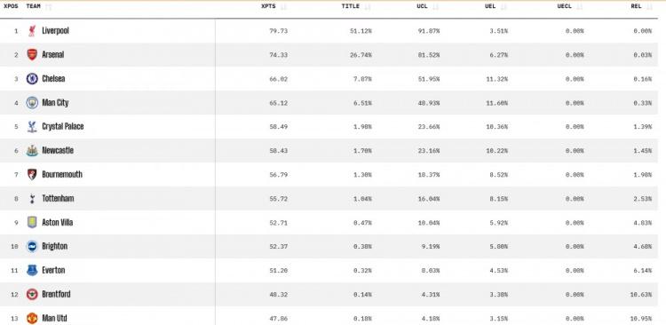 1.利物浦 预期积分79.73分 夺冠概率51.12% 欧冠资历概率91.87% 欧联资历概率3.51% 左迁概率0%