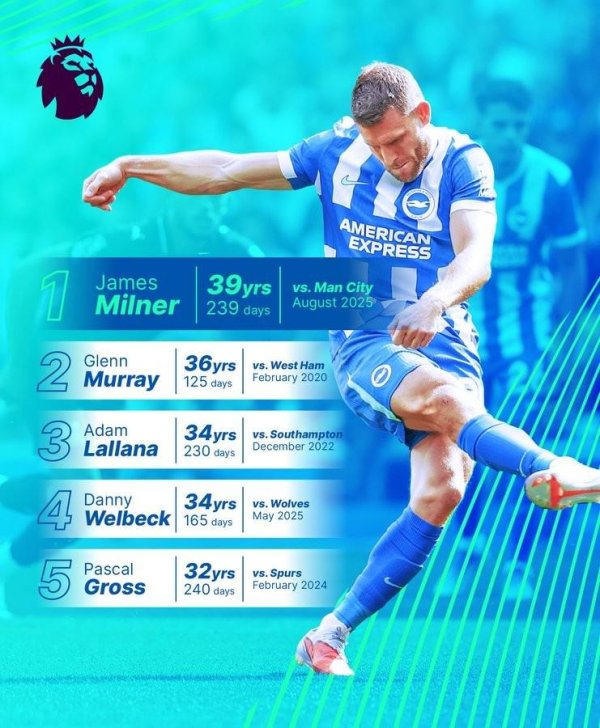 直播吧9月4日讯 布莱顿晒米尔纳海报,道贺他成为球队英超历史最年前程球者。 米尔纳在对阵曼城的比赛中破门,以39岁239天成为布莱顿英超最年前程球者。 布莱顿英超进球球员年岁名次: 1、米尔纳,39岁239天,2025年8月vs曼城 2、格伦-穆雷,36岁125天,2020年2月vs西汉姆 3、拉拉纳,34岁230天,2022年12月vs南安普顿 4、维尔贝克,34岁165天,2025年5月vs狼队 5、格罗斯,32岁240天,2024年2月vs热刺......查看更多