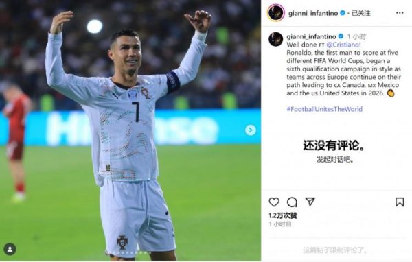因凡蒂诺社媒:干得漂亮,C罗以出色分解开启第6次世初赛征途