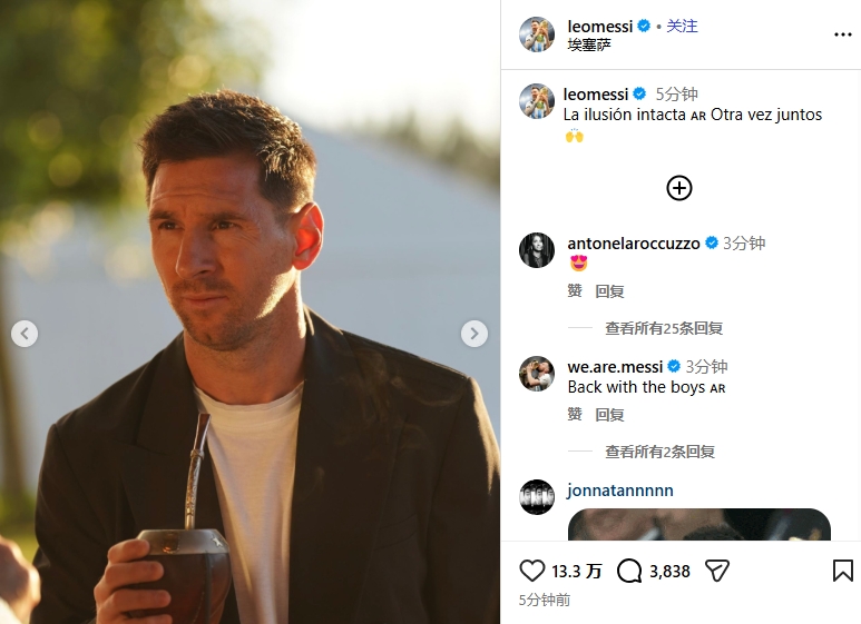 梅西社媒晒出报到照片,并写道:“未破灭的期待🇦🇷 再次相聚 🙌”