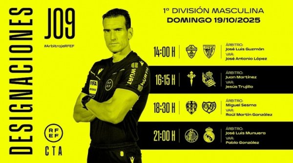 10月19日讯 西班牙足协官方公布了西甲第9轮部分比赛场次的裁判安排,穆努埃拉法则皇马客战赫塔费。 西甲第9轮部分裁判安排如下: 埃尔切VS毕尔巴鄂竞技 主裁判:何塞-路易斯-古兹曼,VAR裁判:何塞-安东尼奥-洛佩斯; 塞尔塔VS皇家社会 主裁判:胡安-马丁内斯,VAR裁判:赫苏斯-特鲁伊略; 莱万特VS巴列卡诺 主裁判:米格尔-塞斯马,VAR裁判:劳尔-马丁-冈萨雷斯; 赫塔费VS皇马 主裁判:何塞-路易斯-穆努埃拉,VAR裁判:巴勃罗-冈萨雷斯。......查看更多
