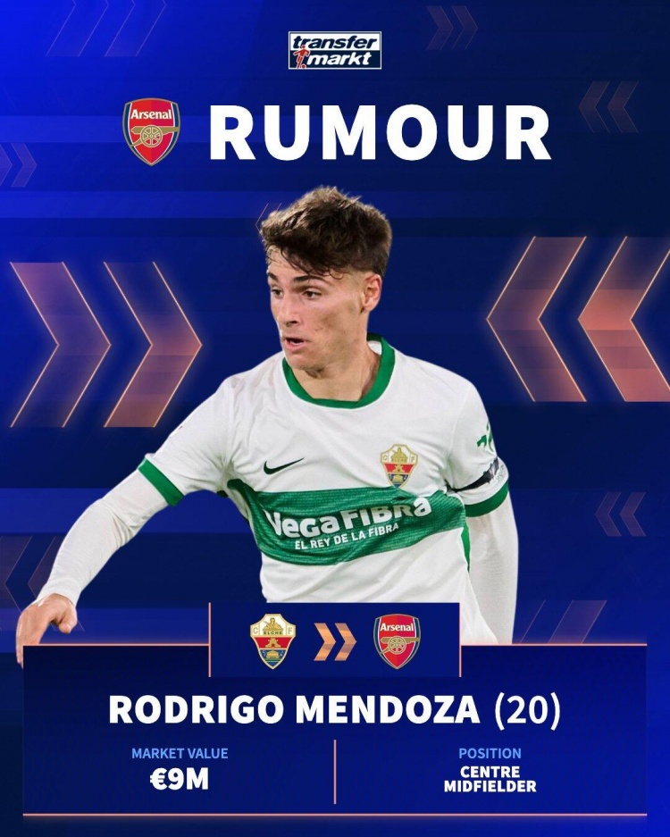 12月1日讯 据罗马诺的报说念,阿森纳在小气现遵守于西甲埃尔切队的20岁中场球员门多萨(Rodrigo Mendoza)。