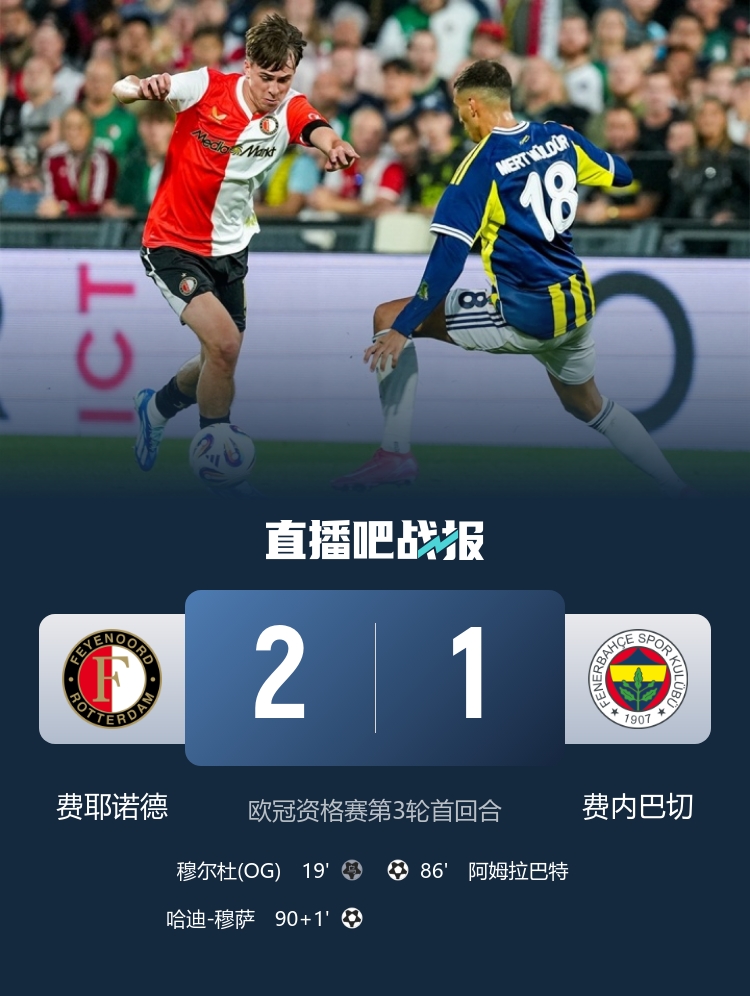 欧冠经历赛第3轮首回合,费内巴切1-2遭费耶诺德绝杀。