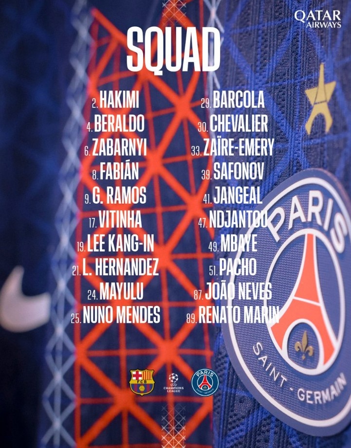 9月30日讯 本轮欧冠迎来焦点战巴黎对阵巴萨,巴黎官方也公布了球队本场大名单,登贝莱、K77缺席,内维斯、法比安追思,具体如下: