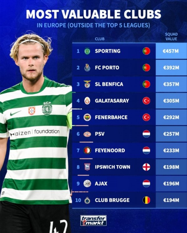 五大联赛除外欧洲俱乐部身价榜:葡萄牙体育、波尔图、本菲卡前三
