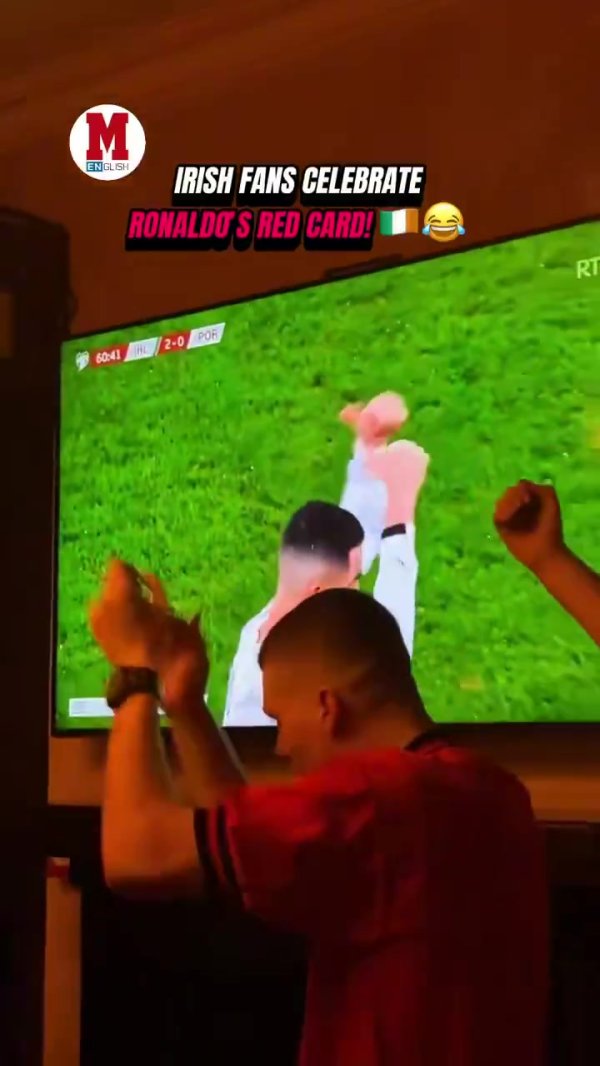 看到C罗被罚下后,一群在酒吧看球的爱尔兰球迷庆祝