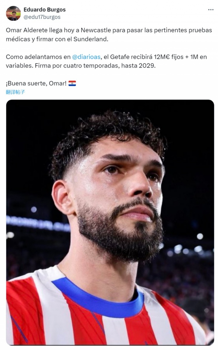 Eduardo Burgos披露,阿德雷特今天抵达纽卡斯尔,领受桑德兰的体检,并与英超升班马签约至2029年,转会费1200万欧+100万欧浮动。