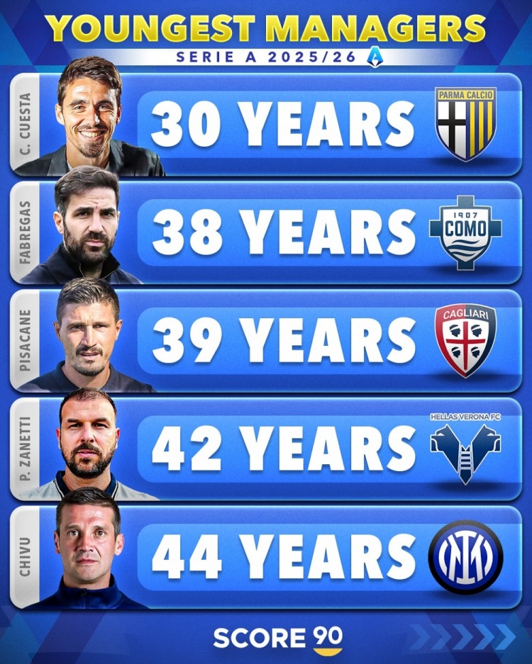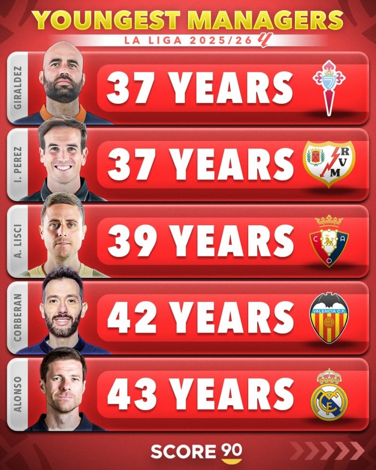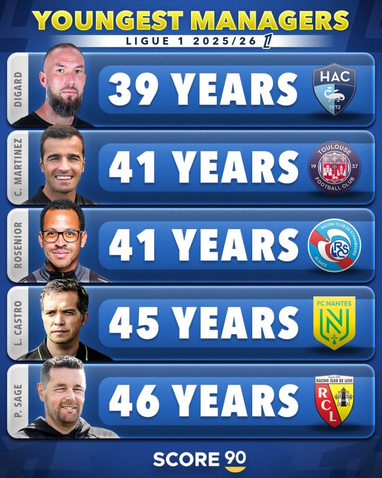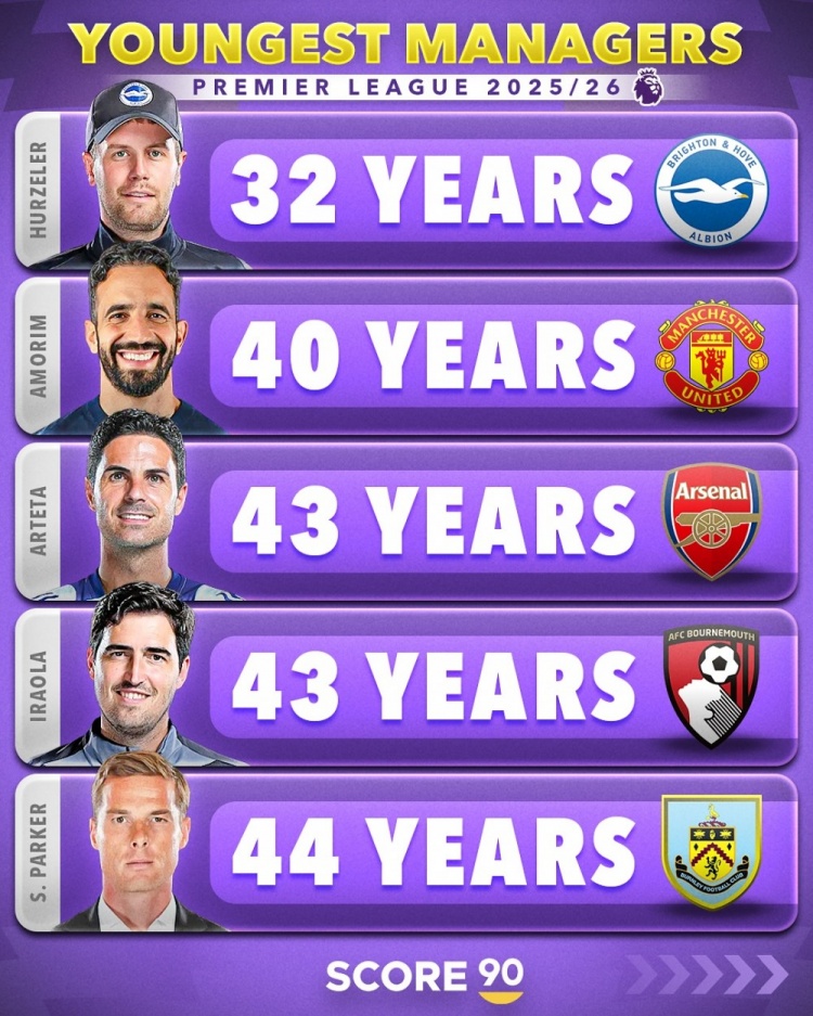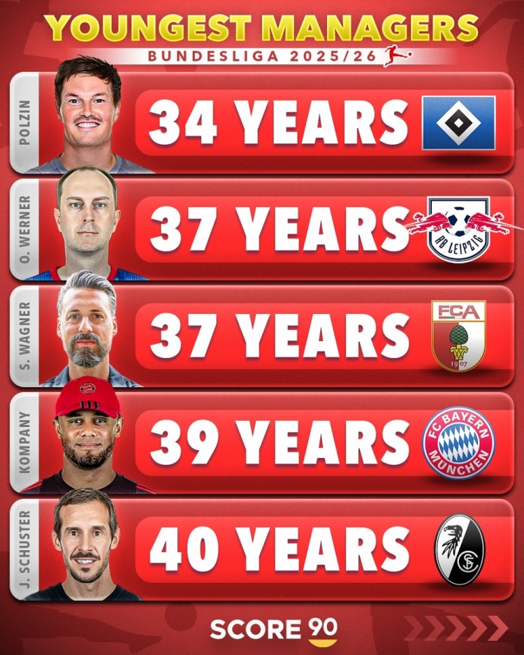 8月17日讯 Score90统计了五大联赛球队在职主帅的年岁,并按照不同的联赛列出最年青主帅排行。