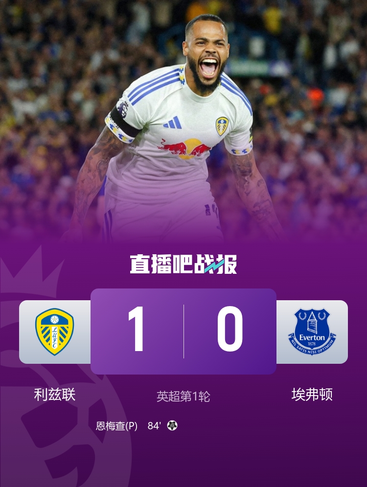 英超第1轮,利兹联在埃兰路球场1-0慑服埃弗顿,利兹联先锋恩梅查在84分钟打进制胜点球。