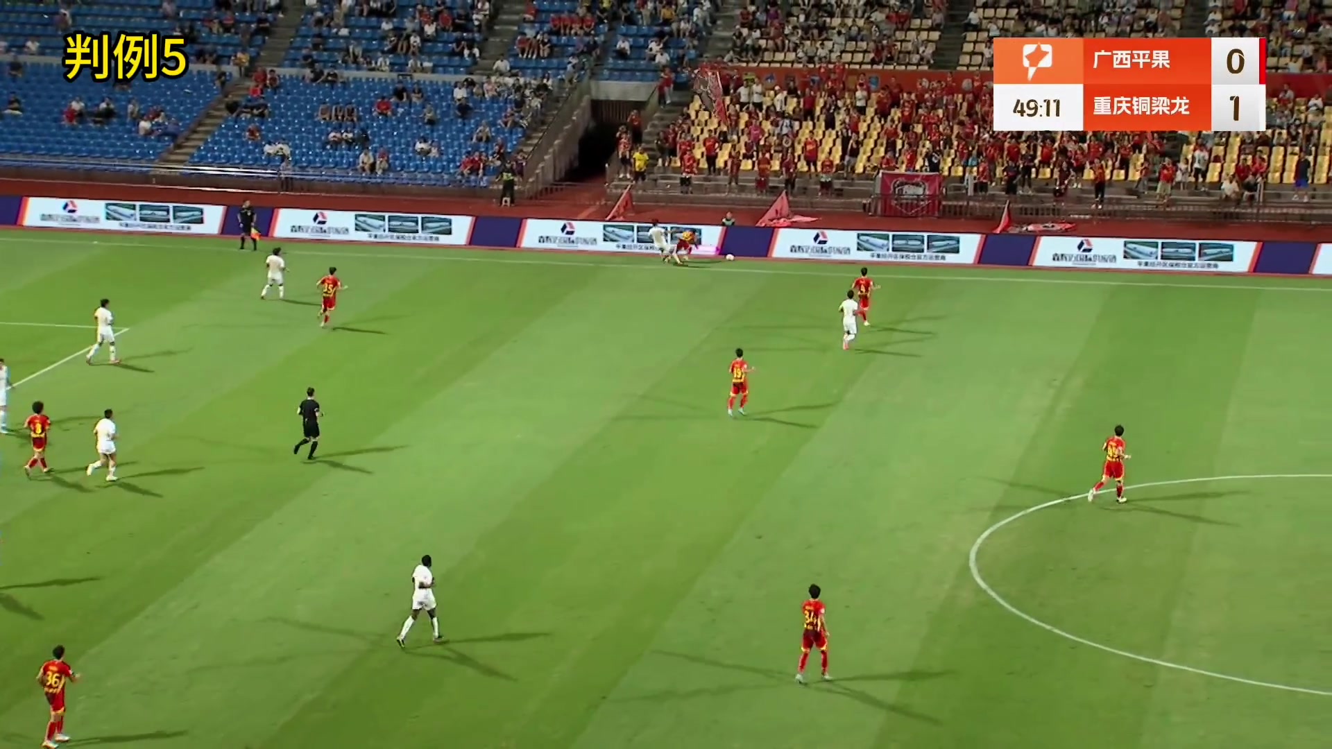 中甲联赛第25轮,广西平果 VS 重庆铜梁龙,比赛第50分钟,重庆铜梁龙16号队员(张志雄)在边线隔壁对广西平果10号队员(阿萨莫阿)犯规,后者与场外LED告白展示建筑斗殴后倒地,后被救护车送往病院。评判员判重庆铜梁龙16号犯规并出示黄牌告诫,VAR未介入。