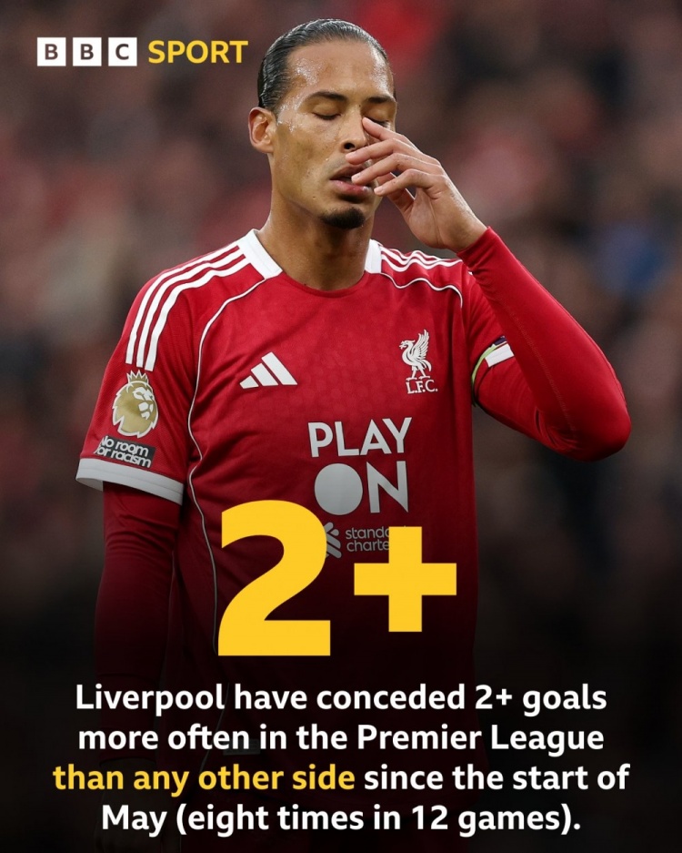 据BBC统计,5月初以来,利物浦进入12场英超比赛,其中8场至少丢掉2球,同时丢球2+场次英超球队中最多。