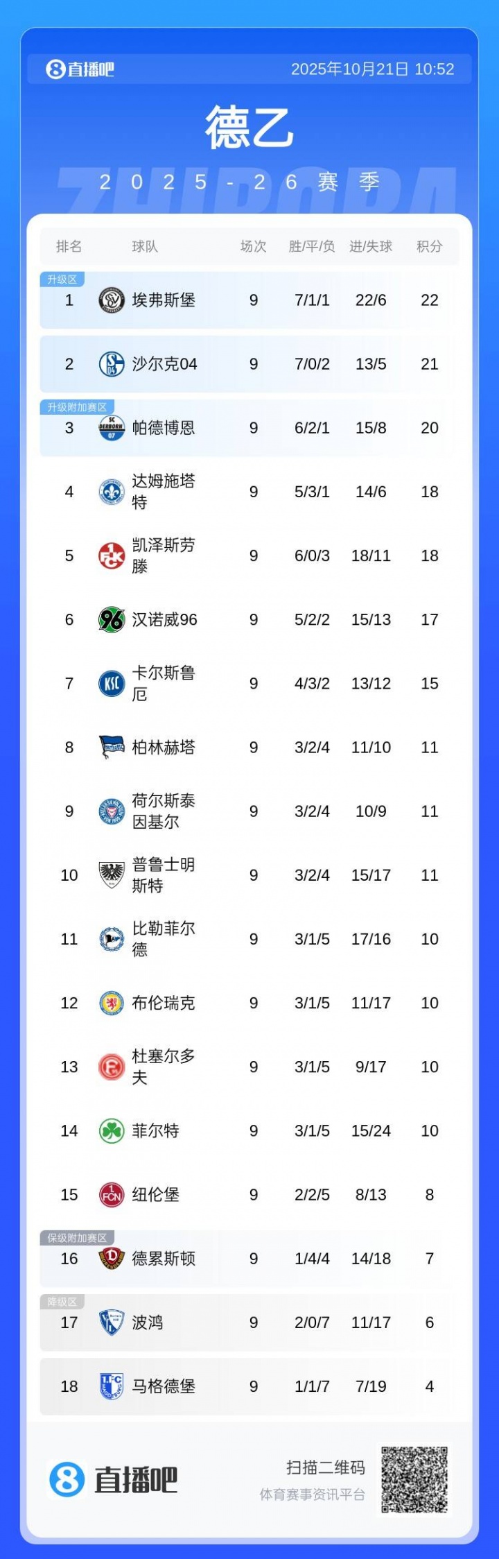 10月21日讯 德乙第9轮沿途战罢后,沙尔克04暂时名次德乙第2,仅差榜首1分。